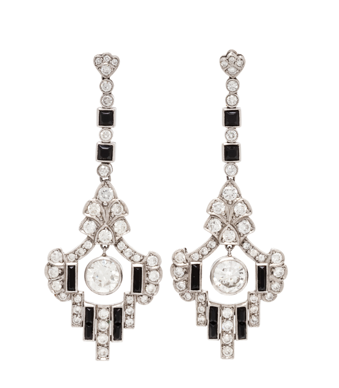 A Pair of Platinum, Diamond and Onyx Pendant Earrings, 7.00 dwts.