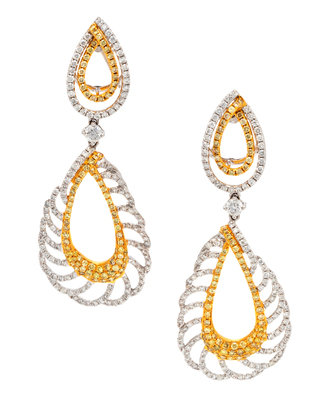 containing two round brilliant cut diamonds weighing approximately 0.45 carat total, 171 round brilliant cut yellow diamonds (origin of color not tested) weighing approximately 2.35 carats and 250 round brilliant cut diamonds weighing approximately 3.30 carats total, with folding posts with clip backs.Stamp: AKMS 18K.