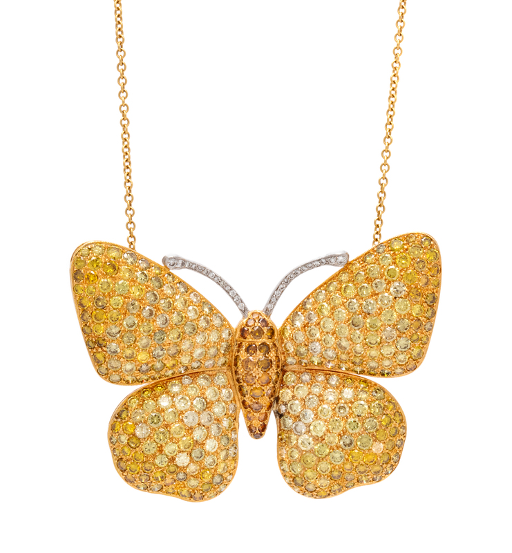 An 18 Karat Bicolor Gold, Diamond and Colored Diamond Butterfly Pendant/Brooch, 14.00 dwts.