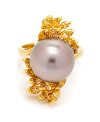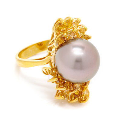 An 18 Karat Yellow Gold, Cultured South Sea Pearl and Colored Diamond Ring, 6.60 dwts.
