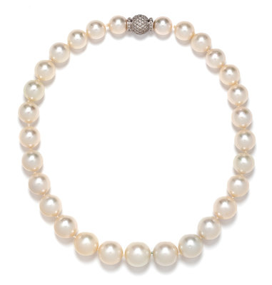 A Platinum, Diamond and Graduated Cultured South Sea Pearl Necklace, 96.10 dwts.