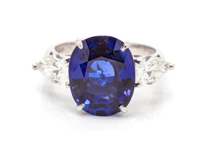 containing one oval shape mixed cut sapphire measuring approximately 13.48 x 10.92 x 6.60 mm and two pear shape brilliant cut diamonds weighing approximately 1.20 carats total.Stamp: PT950.Accompanied by an American Gemological Laboratories sapphire identification and origin report number 1100036, dated March 26, 2019, stating Mineral Type: Natural Corundum, Variety: Sapphire, Origin: Madagascar, Enhancement: Heat.