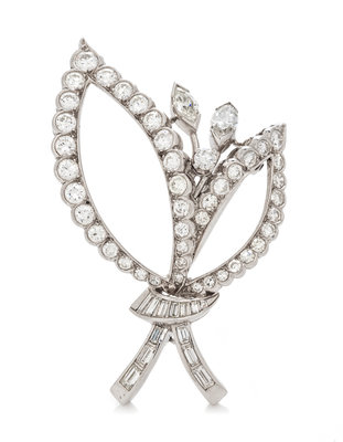 consisting of a stylized leaf motif containing two marquise cut diamonds weighing approximately 0.75 carat total, 13 baguette cut diamonds weighing approximately 0.85 carat total and 43 round brilliant and single cut diamonds weighing approximately 1.75 carats total.