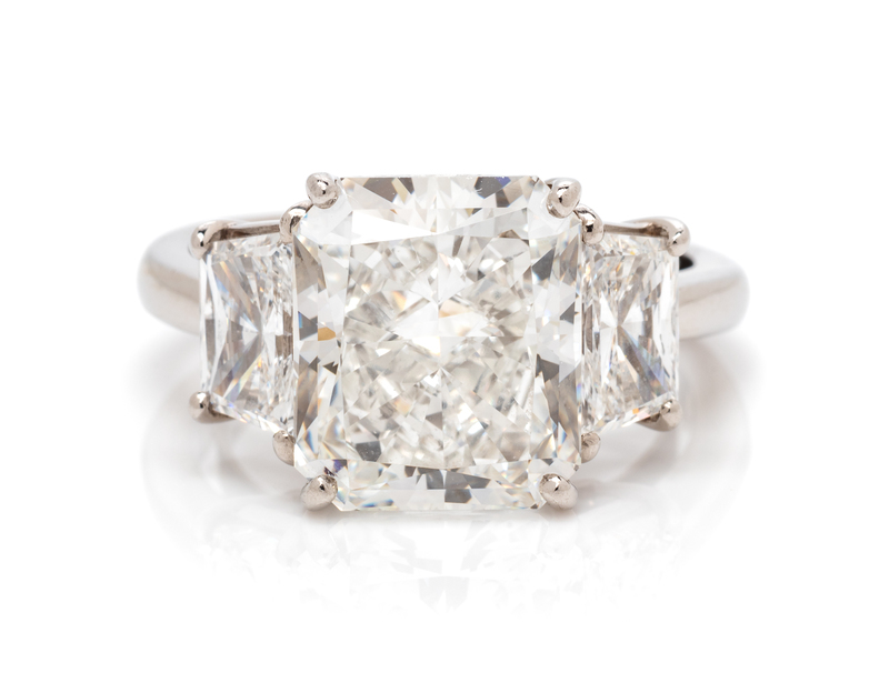 containing one radiant cut diamond weighing approximately 6.29 carats and two trapezoid brilliant cut diamonds weighing approximately 1.30 carats total.Accompanied by a Gemological Institute of America diamond grading certificate number 11082800 dated March 29, 2019 stating Color: F, Clarity: VS1. Polish: Very Good, Symmerty: Good, Fluorescence: None.