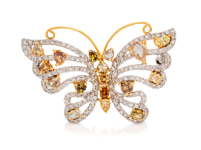 An 18 Karat Bicolor Gold, Diamond and Colored Diamond Butterfly Pendant/Brooch, 8.20 dwts.