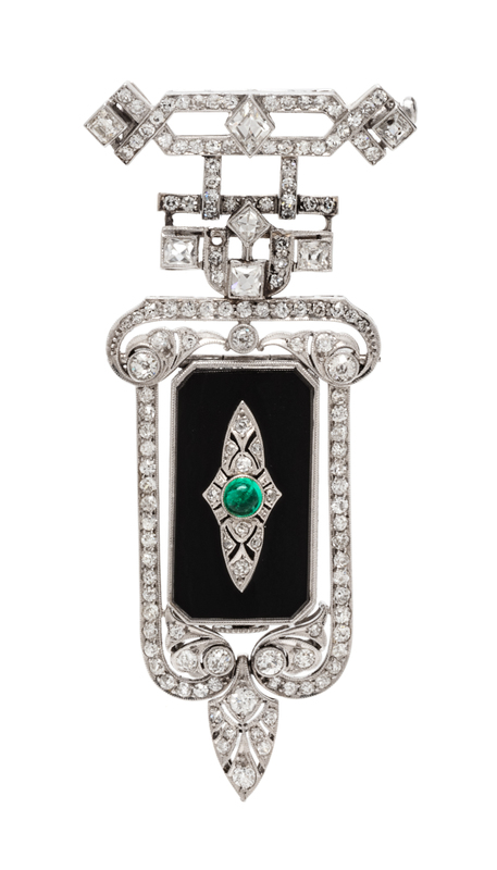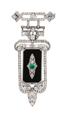 An Art Deco Platinum, Diamond, Onyx and Emerald Lapel Watch, Elaine, 18.00 dwts.