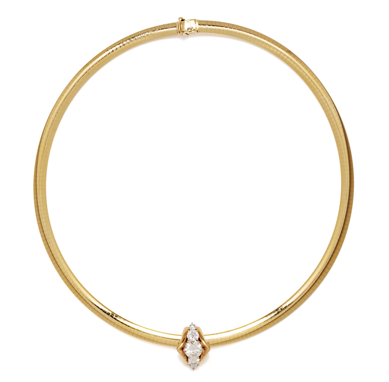 consisting of a slide pendant containing one round brilliant cut diamond weighing approximately 1.65 carats, two round brilliant cut diamonds weighing approximately 0.90 carat total and two round brilliant cut diamonds weighing approximately 0.25 carat total suspended from an omega chain necklace measuring approximately 5.85 mm wide.Clasp stamp: 14KT ITALY (maker's mark).