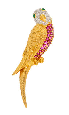 An 18 Karat Yellow Gold, Ruby, Diamond and Emerald Parrot Brooch, 11.50 dwts.