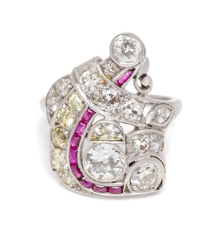 containing one marquise cut, one half moon, and numerous old European and round single cut diamonds weighing approximately 1.50 carats total and nine calibre cut rubies in a swirling design with millegrain detail.Stamp: R8823 10% (obscured).