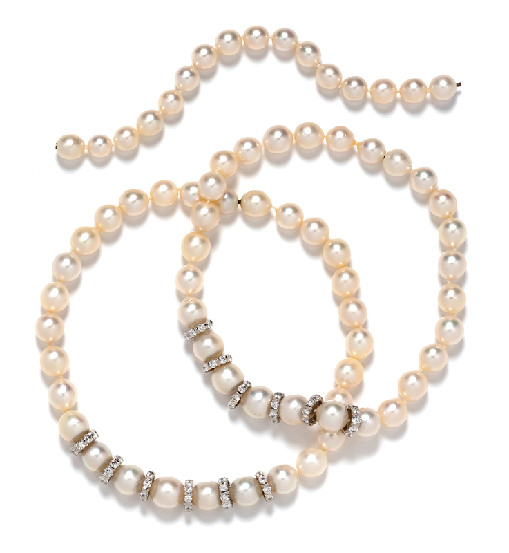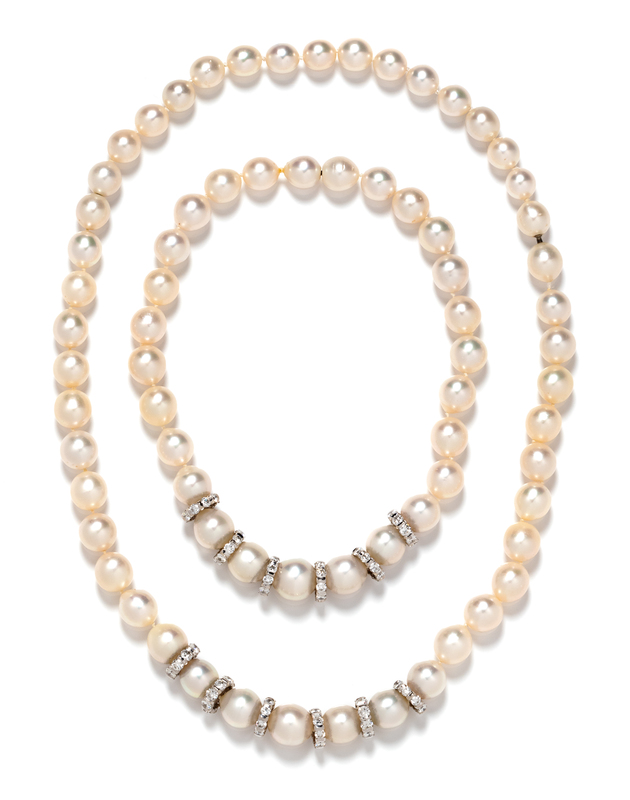 consisting of three sections that can be worn as two separate necklaces and one bracelet or combined, one section containing 27 off-round South Sea pearls measuring approximately 11.75 x 14.15 mm, strung knotted with six spacer beads containing 54 round brilliant cut diamonds weighing approximately 7.25 carats total and a mystery clasp, a section containing 29 off-round South Sea pearls measuring approximately 11.25 x 13.65 mm, strung knotted with six spacer beads containing 54 round brilliant cut diamonds weighing approximately 8.75 carats total and a mystery clasp, together with a section containing 16 off-round South Sea pearls measuring approximately 10.60 mm strung knotted with a mystery clasp.