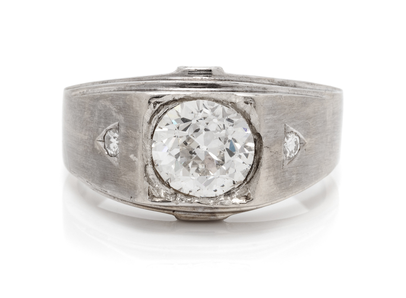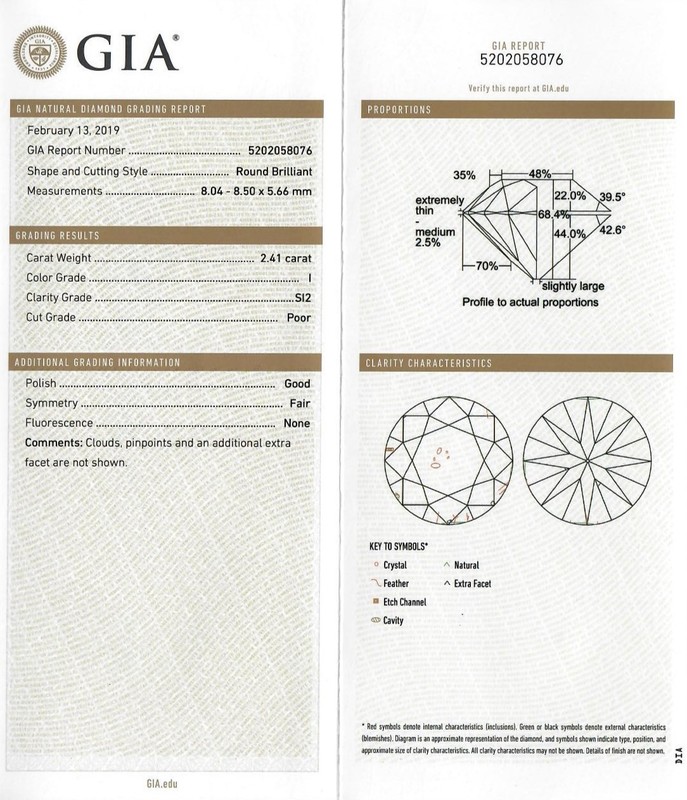 containing one round brilliant cut diamond weighing 2.41 carats and two round single cut diamonds weighing approximately 0.10 carat total. Stamp: 14K (maker's mark).Accompanied by a Gemological Institute of America diamond grading certificate number 5202058076, dated February 13, 2019, stating Color: I, Clarity: SI2, Cut: Poor, Polish: Good, Symmetry: Fair, Fluorescence: None.