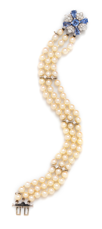 consisting of three strands of pearls measuring approximately 5.25 mm in diameter strung knotted with three white gold spacer bars containing six round brilliant cut diamonds, the clasp containing one square octagonal step cut sapphire measuring approximately 5.60 x 5.60 mm, four calf's head cut sapphires measuring approximately 6.90 x 5.20 mm and 24 round brilliant and single cut diamonds weighing approximately 0.60 carat total.