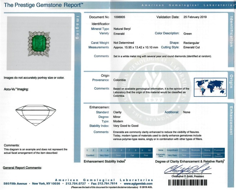 consisting of one octagonal step cut emerald weighing approximately 14.75 carats and 18 round and pear shape brilliant cut diamonds weighing approximately 4.10 carats total.Stamp: PLAT.Accompanied by an American Gemological Laboratories emerald identification and origin certificate number 1098805, dated February 25, 2019, stating Mineral Type: Natural Beryl, Variety: Emerald, Origin: Colombia, Clarity Enhancement: Minor, Type: Modern.