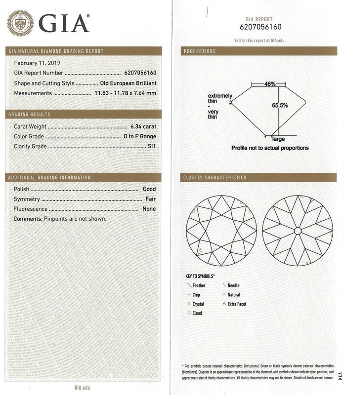 measuring 11.53-11.78 x 7.64 mm. Accompanied by a Gemological Institute of America diamond grading certificate number 6207056160, dated February 11, 2019, stating Color: O-P, Clarity: SI1, Polish: Good, Symmetry: Fair, Fluorescence: None.