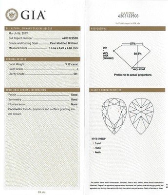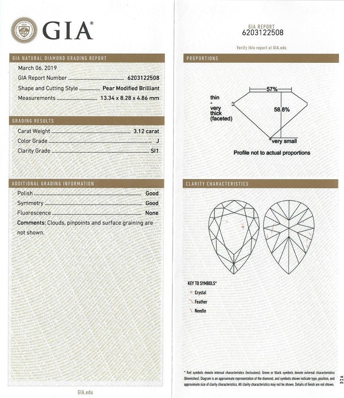 measuring 13.34 x 8.28 x 4.86 mm.Accompanied by a Gemological Institute of America diamond grading certificate number 6203122508, dated March 6, 2019, stating Color: J, Clarity: SI1, Polish: Good, Symmetry: Good, Fluorescence: None.