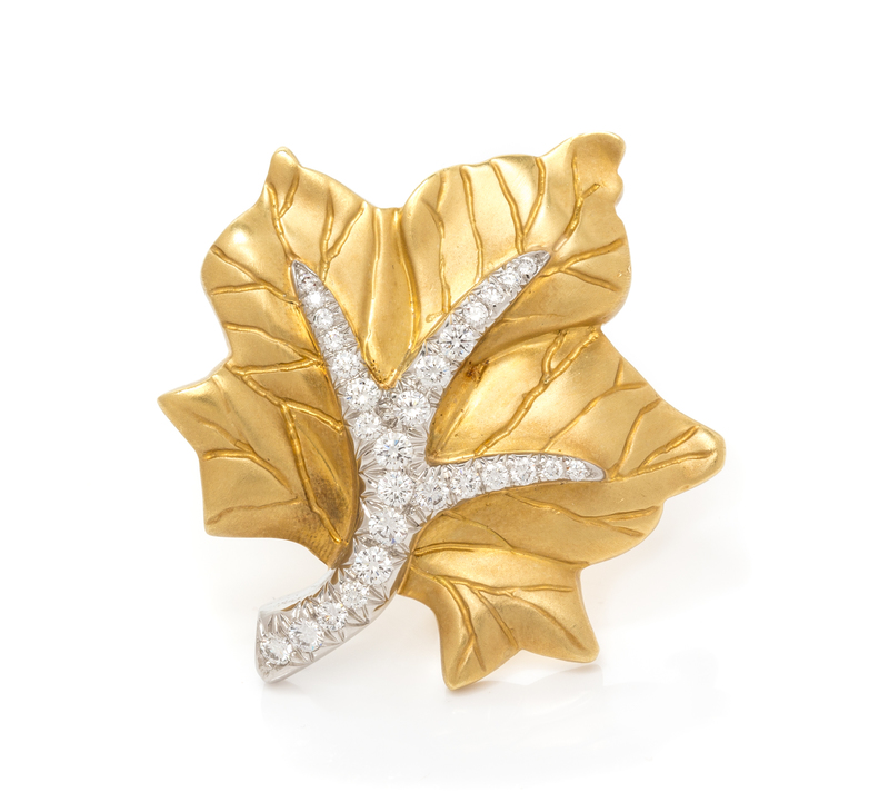 A Pair of 18 Karat Yellow Gold, Platinum and Diamond Leaf Brooches, Marlene Stowe, 20.50 dwts.