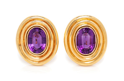 A Pair of 14 Karat Yellow Gold and Amethyst Earclips, 15.30 dwts.