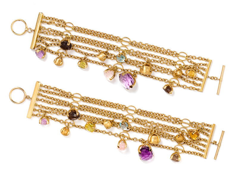 consisting of two bracelets, each containing seven gold chains suspending numerous pendants containing oval mixed cut amethyst, blue topaz, citrine, rose quartz, and citrine, with later altered clasp.Stamp: NANIS 750 (Italian maker's mark) ITALY.