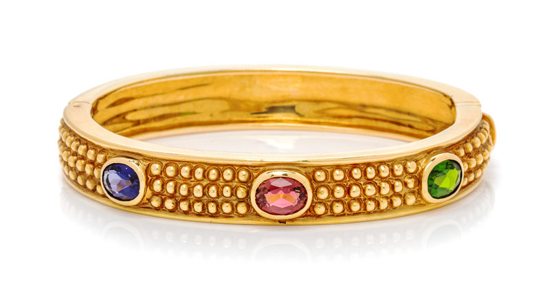 An 18 Karat Yellow Gold, Tanzanite, Pink Tourmaline and Diopside Bangle Bracelet, 35.00 dwts.