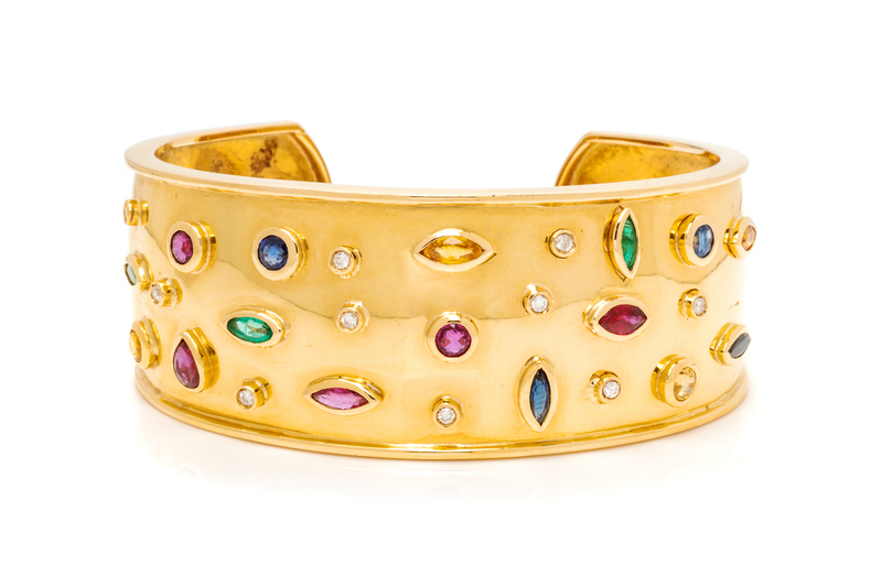 A Yellow Gold, Diamond and Multigem Cuff Bracelet, Chantecler of Capri, 27.30 dwts.
