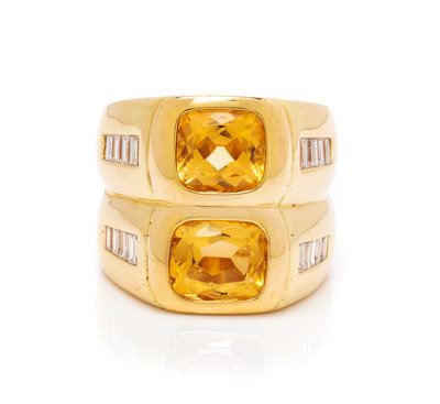 containing two cushion shape mixed cut citrines measuring approximately 8.60 x 6.95 and 7.60 x 7.10 mm and 16 baguette cut diamonds weighing approximately 0.85 carat total.Stamp: 18K (maker's mark).
