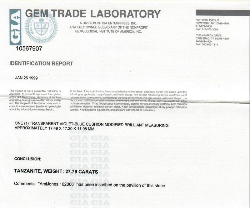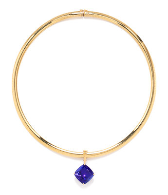 consisting of a pendant containing one cushion shape mixed cut tanzanite weighing 27.79 carats, suspended from an omega chain necklace measuring approximately 5.95 mm wide.Pendant stamp: 14K.Clasp stamp: 14KT ITALY.Accompanied by Gemological Institute of America tanzanite report number 10567907, dated January 26, 1999, stating (1) transparent violet-blue cushion modified brilliant tanzanite, measuring approximately 17.49 x 17.30 x 11.98 mm, weight: 27.79 carats, comments: "Ami Jones 102006" has been inscribed on the pavilion of this stone.