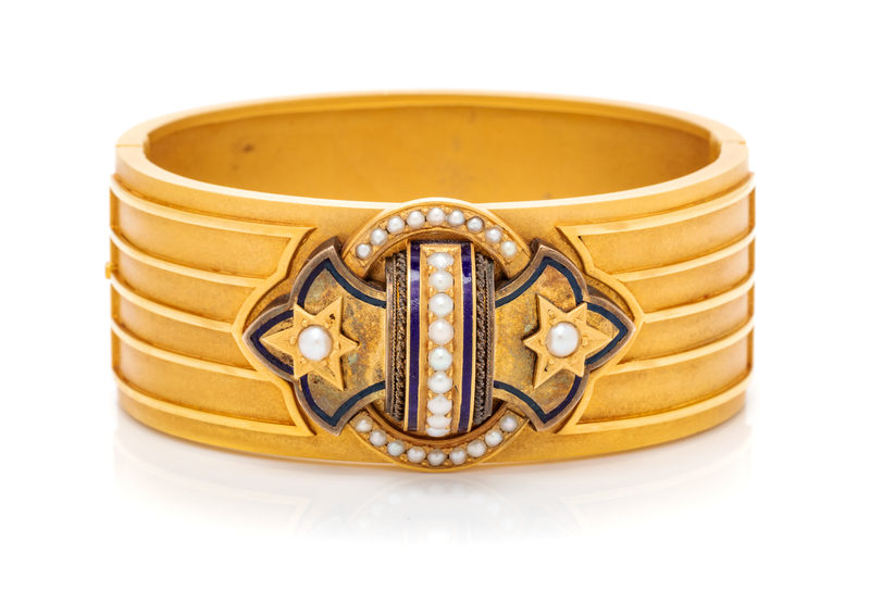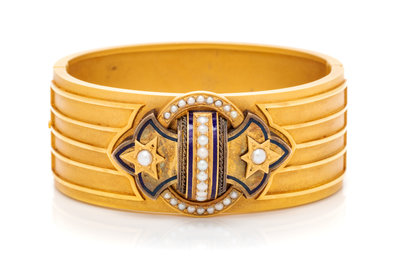A Yellow Gold, Cultured Pearl and Enamel Bangle Bracelet, 42.00 dwts.
