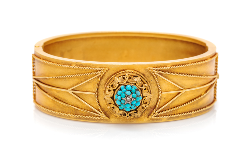 A 14 Karat Yellow Gold, Turquoise and Diamond Bangle Bracelet, 30.00 dwts.
