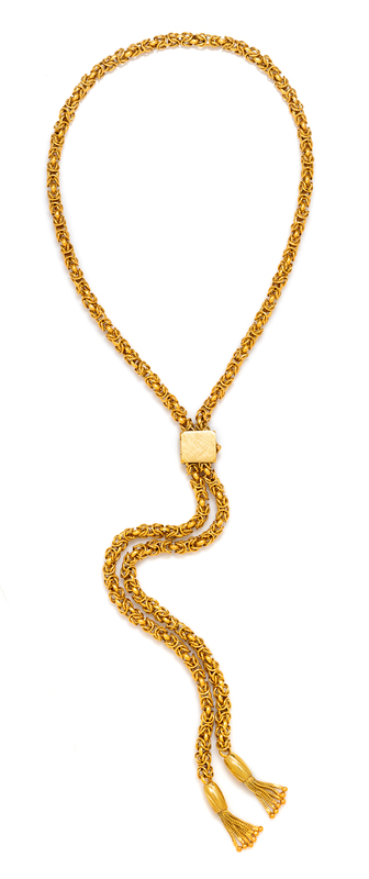 consisting of a Byzantine link chain measuring approximately 5.15 mm wide with an adjustable square box clasp with Florentine finish and gold barrel finials with wheat chain fringe.Stamp: 18K.