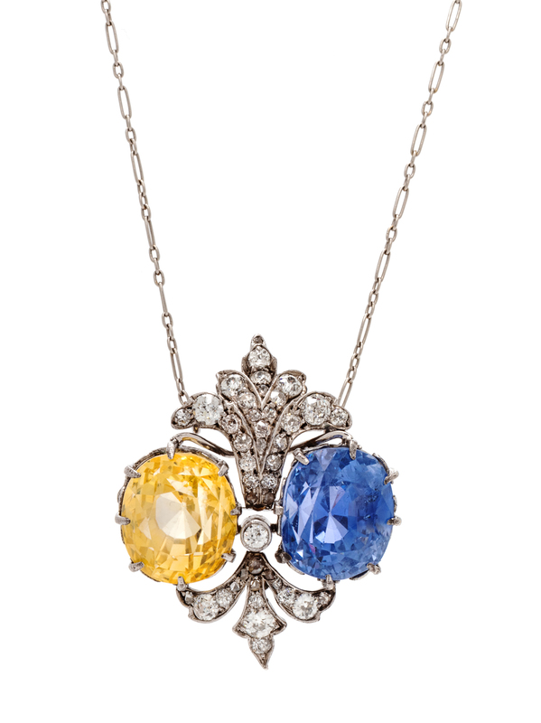 consisting of a fleur-de-lis motif pendant containing one cushion shape mixed cut yellow sapphire measuring approximately 13.10 x 11.30 x 11.15 mm, one cushion shape mixed cut blue sapphire measuring approximately 13.20 x 11.25 x 11.00 mm and 42 old European and mixed cut diamonds weighing approximately 1.75 carats total suspended from a fancy link chain.