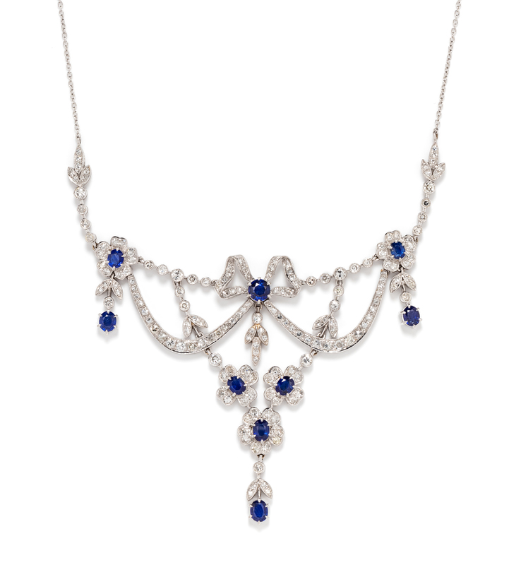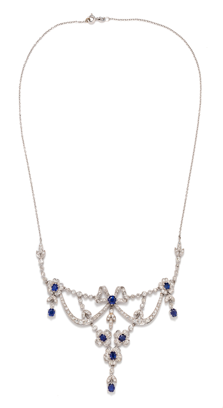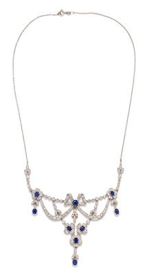 consisting of an articulated swag ribbon and floral motif necklace containing 187 transitional cut and round single cut diamonds weighing approximately 4.00 carats total, one round mixed cut sapphire measuring approximately 5.20 mm in diameter and eight oval shape mixed cut sapphires measuring approximately 4.40 x 3.80 to 5.00 x 4.20 mm, suspended from a cable link chain.