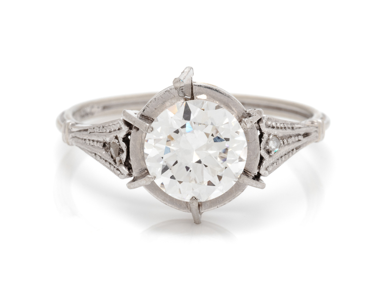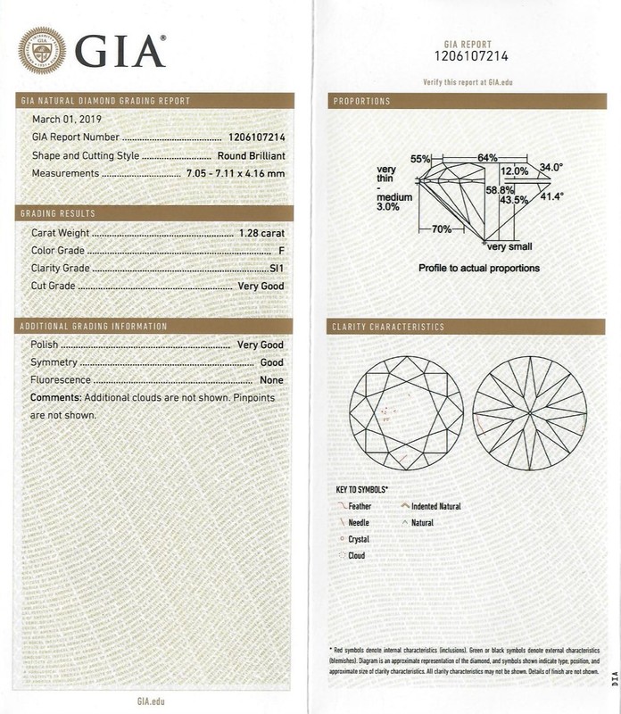 containing one round brilliant cut diamond weighing 1.28 carats and two rose cut diamonds.Stamp: 18Ct.Accompanied by a Gemological Institute of America diamond grading certificate number 1206107214, dated March 1, 2019, stating Color: F, Clarity: SI1, Cut: Very Good, Polish: Very Good, Symmetry: Good, Fluorescence: None.