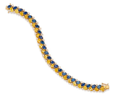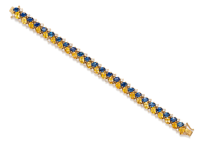 containing 24 oval shape mixed cut blue sapphires measuring approximately 6.00 x 4.00 mm, 24 oval shape mixed cut yellow sapphires measuring approximately 6.00 x 4.00 mm and 48 round brilliant cut diamonds weighing approximately 2.40 carats total.Stamp: 18K.