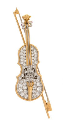 An 18 Karat Yellow Gold, Platinum, Diamond and Ruby Violin Brooch, Oscar Heyman & Brothers, Circa 1973, 10.50 dwts.
