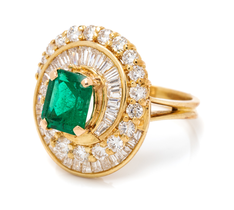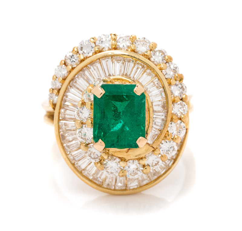 containing one octagonal step cut emerald measuring approximately 8.35 x 6.80 x 5.00 mm, 22 round brilliant cut diamonds weighing approximately 0.90 carat total and 34 baguette cut diamonds weighing approximately 1.15 carats total.Stamp: 585 JO.