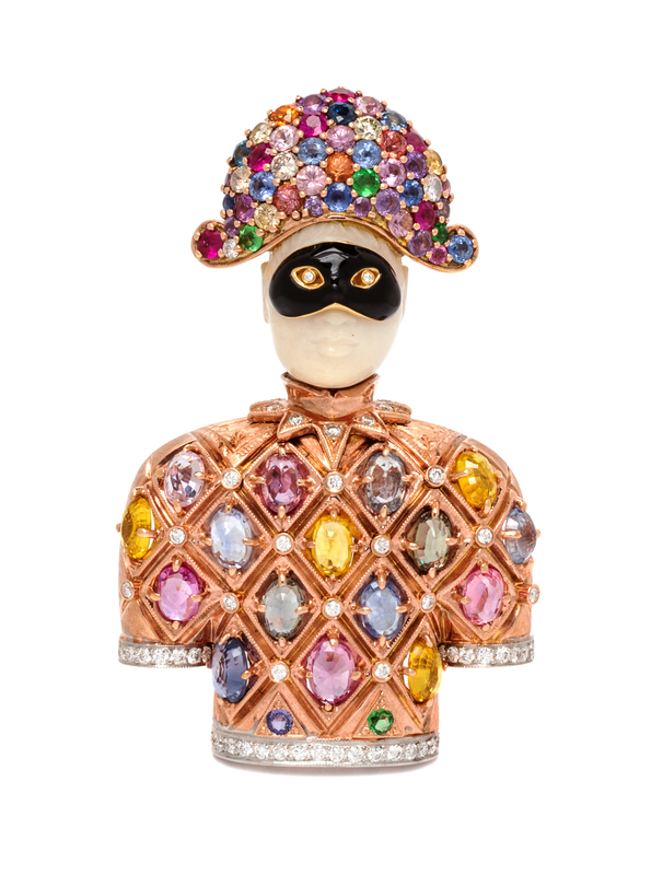 depicting the Commedia dell'Arte character, Arlecchino, wearing a Venetian mask and hat, consisting of a carved white chalcedony head with black enamel mask containing two round brilliant cut diamonds, the hat containing 55 round mixed cut rubies, multicolor sapphires, amethysts, emeralds and diamonds measuring approximately 1.60-2.70 mm in diameter, the tunic containing 16 oval shape mixed cut multicolor gemstones including sapphires and tourmalines measuring approximately 6.00 x 3.65 mm, one round mixed cut amethyst and tsavorite garnet measuring approximately 2.45 mm in diameter and 55 round brilliant cut diamonds weighing approximately 0.95 carat total.Engraved: VENEZIA A. NARDI 750.