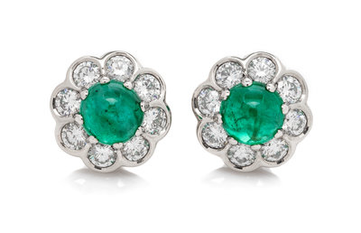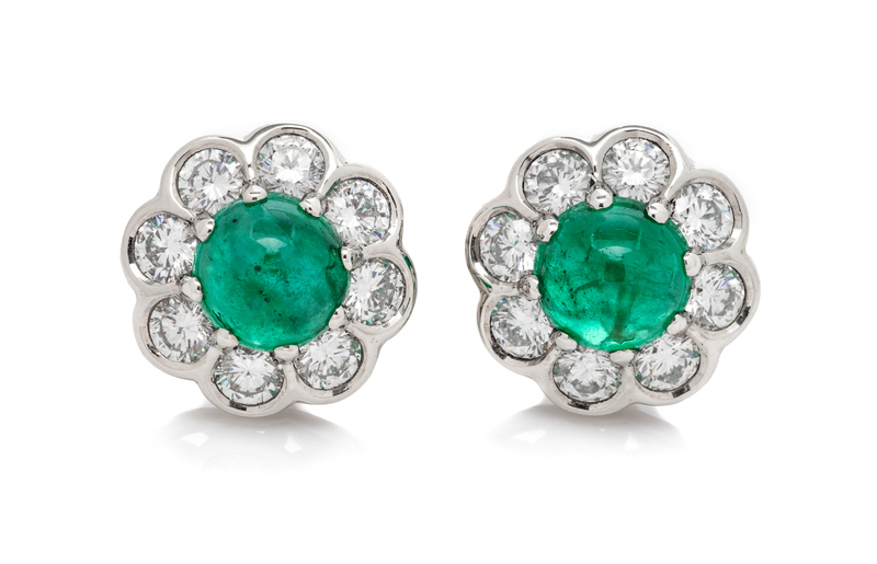 containing two round cabochon cut emeralds weighing approximately 3.45 carats total and 16 round brilliant cut diamonds weighing approximately 2.10 carats total, posts with clip backs.Stamp: PT950.