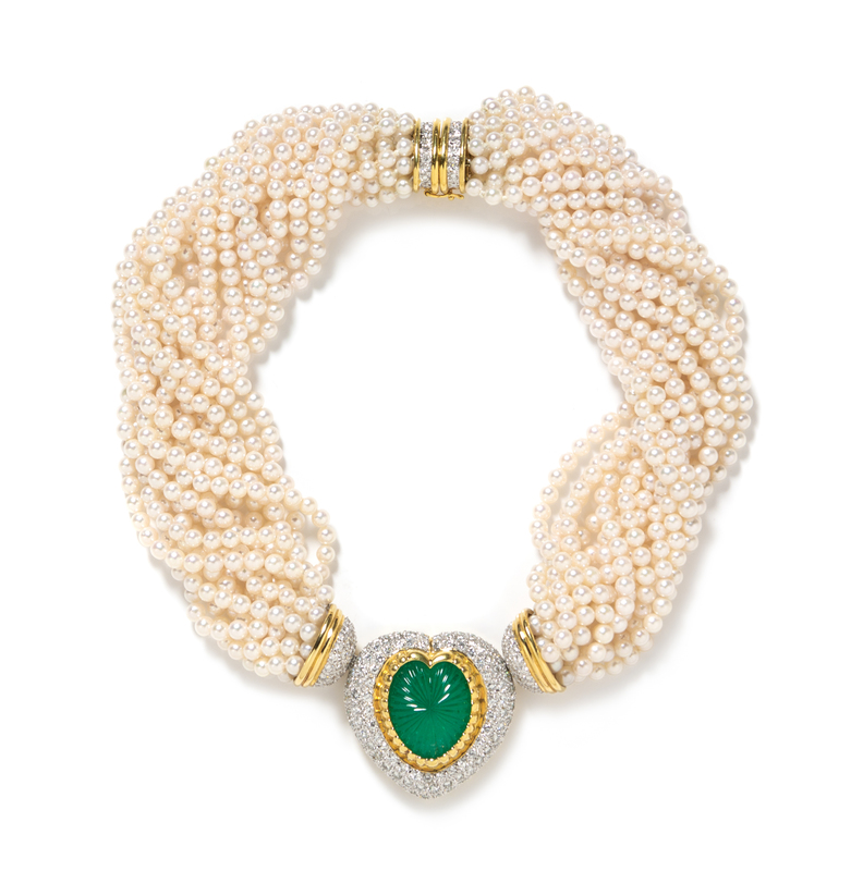 containing a heart shape melon carved emerald measuring approximately 22.00 x 18.80 x 11.40 mm and 196 round brilliant cut diamonds weighing approximately 6.00 carats total, with 14 strands of pearls measuring approximately 4.25 mm in diameter strung with a yellow gold clasp containing 22 round brilliant cut diamonds weighing approximately 0.75 carat total. Stamp: MARSHALL 18K 750.