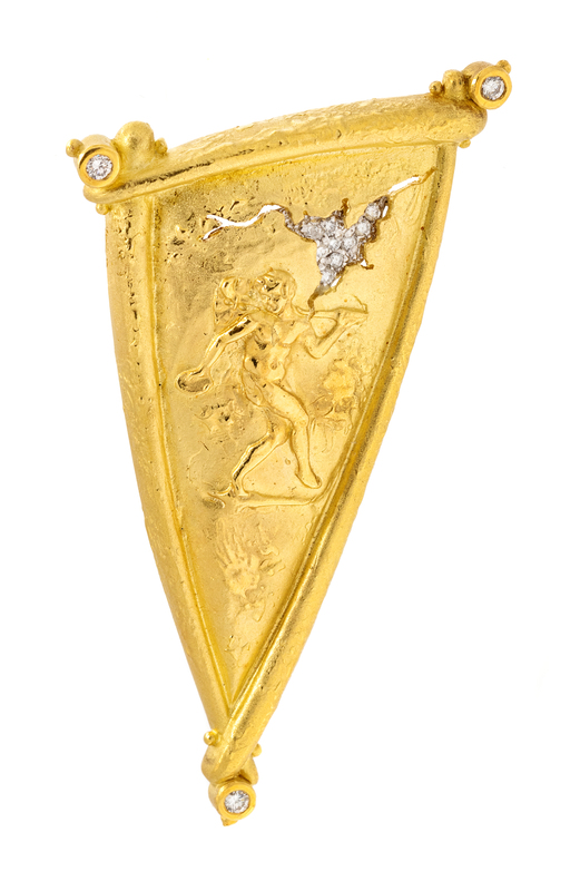 consisting of a curved triangular shape brooch with an intaglio design of a Classical male figure, containing 12 round brilliant cut diamonds weighing approximately 0.15 carat total.Stamp: (maker's mark for SeidenGang) 18K PLAT.
