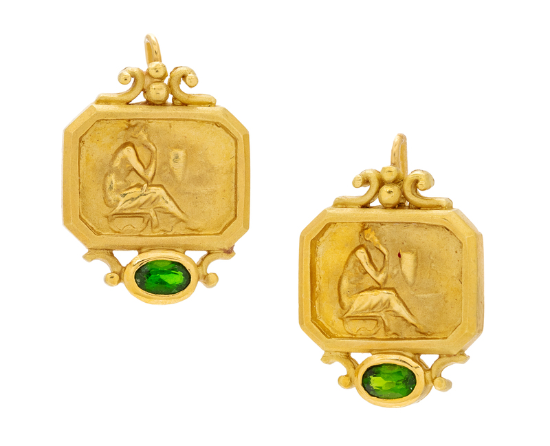 consisting of gold intaglio plaques depicting a Classical seated figure within octagonal surrounds and two oval shape mixed cut green tourmalines measuring approximately 4.80 x 2.90 x 2.30 mm.Stamp: SG (maker's mark for SeidenGang) 18K.
