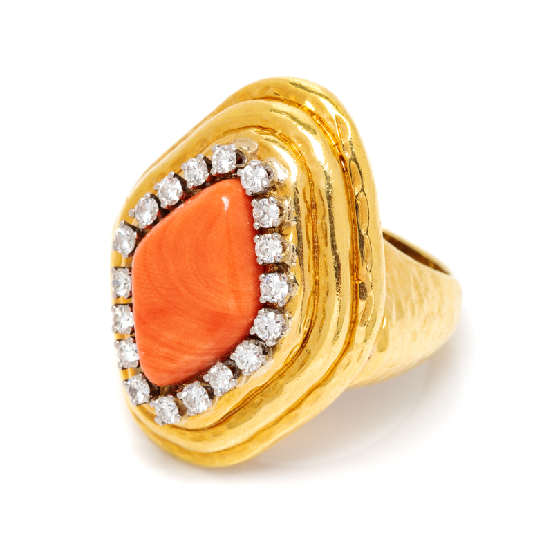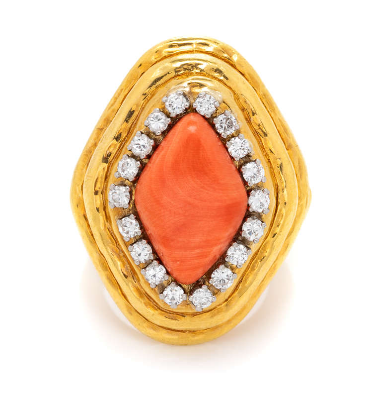 An 18 Karat Yellow Gold, Coral and Diamond Ring, Charles Turi, 13.00 dwts.