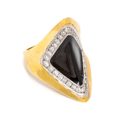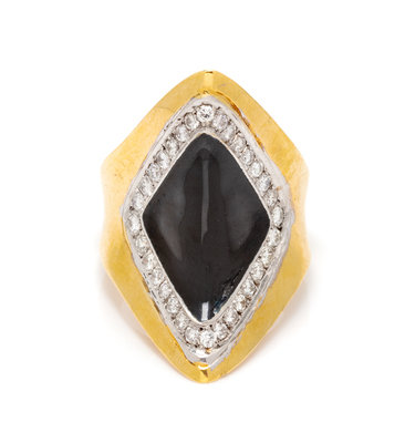 consisting of central lozenge shape black enamel and 24 round brilliant cut diamonds weighing approximately 0.50 carat total.Stamp: 18K.