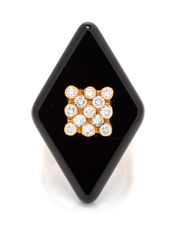 containing one lozenge shape onyx plaque measuring approximately 35.00 x 22.00 mm surmounted with 13 round brilliant cut diamonds weighing approximately 0.60 carat total.Stamp: J.W. 750 FRANCE 18K (French hallmarks).