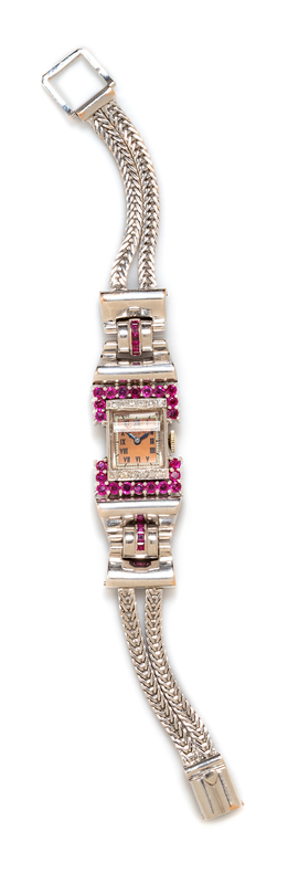 A Retro 14 Karat White Gold, Ruby and Diamond Wristwatch, Paul Ditisheim Solvil, 25.00 dwts.