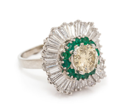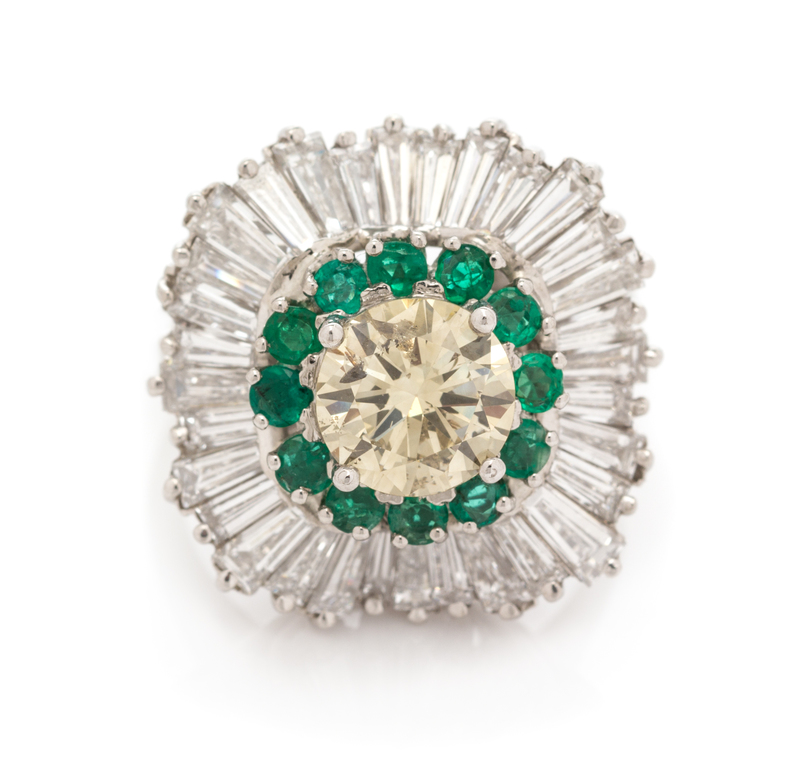 containing one round brilliant cut diamond weighing approximately 1.53 carats, 32 tapered baguette cut diamonds weighing approximately 3.25 carats total and 12 round mixed cut emeralds measuring approximately 2.00 mm in diameter, the central portion of the ring detaches and can be worn as a pendant.Stamp: PALAIS PATENTED PLATINUM RING-DANT B 7 R7341.