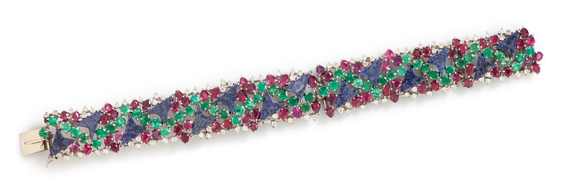 A 14 Karat White Gold, Lapis Lazuli, Ruby, Emerald and Diamond Bracelet, 31.80 dwts.