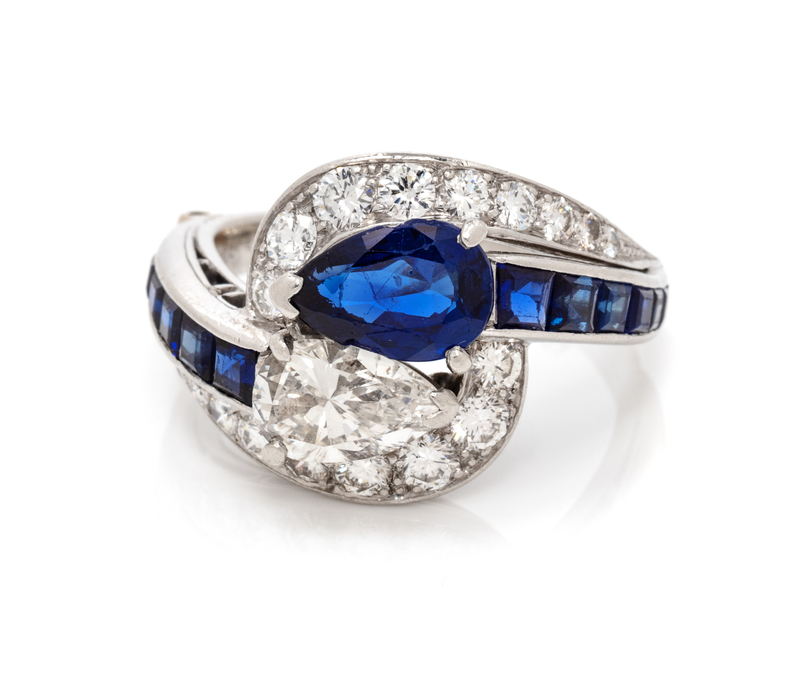 containing one pear shape brilliant cut diamond weighing approximately 0.95 carat, one pear shape mixed cut sapphire measuring approximately 8.50 x 6.00 mm, 18 round brilliant cut diamonds weighing approximately 0.75 carat total and 12 square step and calibre cut sapphires.Stamp: IRID. PLAT 52625.