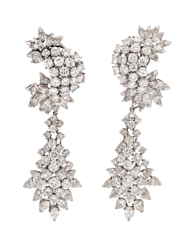 consisting of a pair of earclips containing 40 round brilliant cut diamonds weighing approximately 6.40 carats total and 18 marquise cut diamonds weighing approximately 3.60 carats total, posts with clip backs, with removable drops containing 40 round brilliant cut diamonds weighing approximately 3.45 carats total, 24 pear shape brilliant cut diamonds weighing approximately 6.00 carats total and two marquise cut diamonds weighing approximately 0.55 carat total.