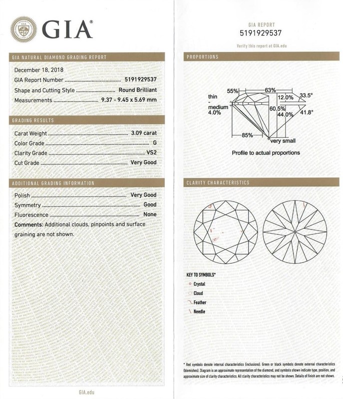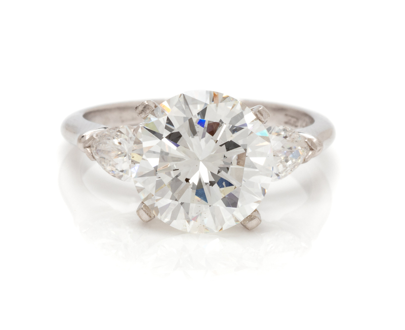 containing one round brilliant cut diamond weighing 3.09 carats and two pear shape brilliant cut diamonds weighing approximately 0.50 carat total.Stamp: (HRD maker's mark)10%IRID PLAT 054.Accompanied by a Gemological Institute of America diamond grading certificate number 5191929537, dated December 18, 2018, stating Color: G, Clarity: VS2, Cut: Very Good, Polish: Very Good, Symmetry: Good, Fluorescence: None.