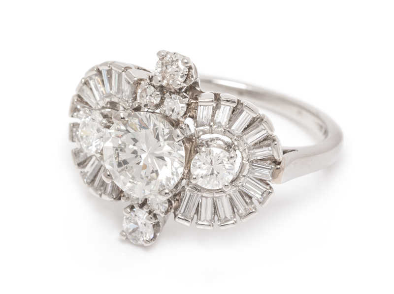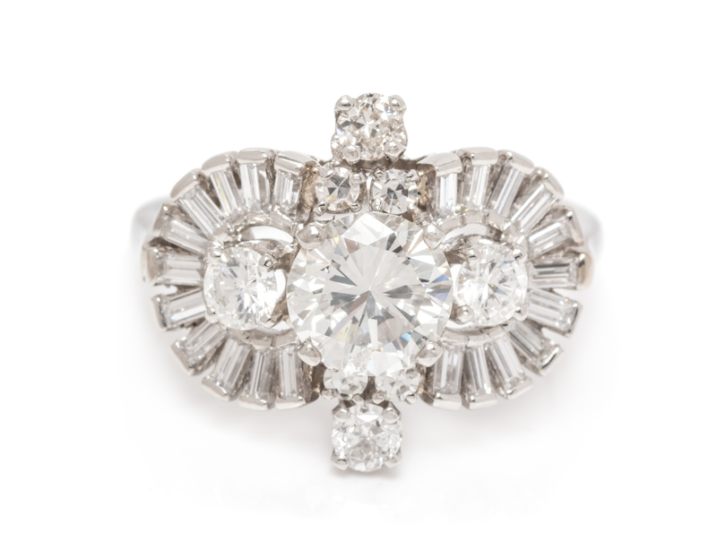 containing one round brilliant cut diamond weighing approximately 1.32 carats, four round brilliant cut diamonds weighing approximately 0.55 carat total, four round single cut diamonds weighing approximately 0.08 carat total and 22 baguette cut diamonds weighing approximately 0.60 carat total.Stamp: .900 PLAT. 100 (obscured) 15883 PEACOC (obscured).
